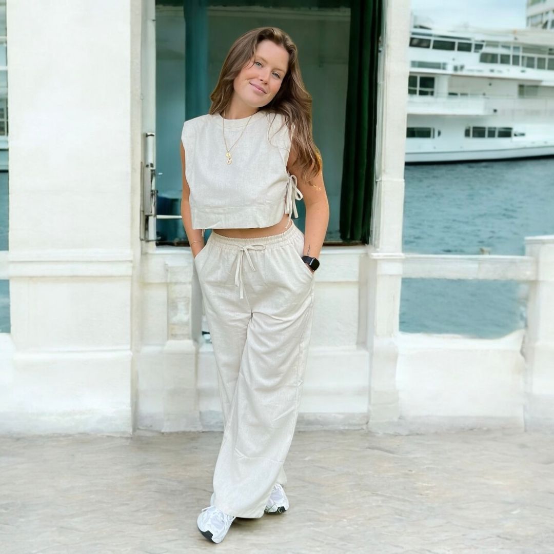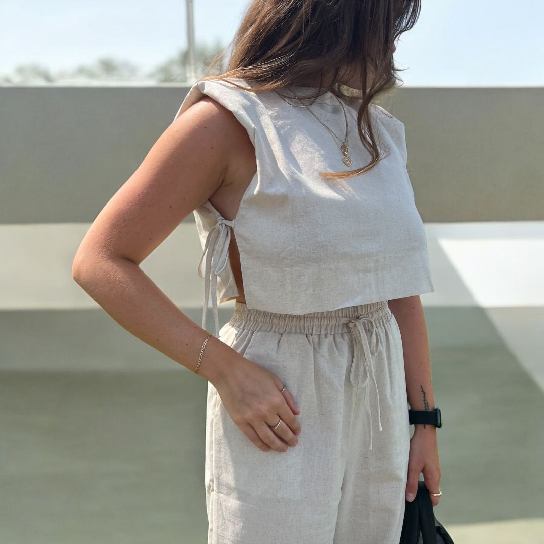 The linen fabric not only adds a touch of natural elegance but also ensures breathability, keeping you cool even on the hottest days. The impeccable workmanship reflects in every detail, creating a seamless blend of style and comfort. The sleeveless crop top and elastic waist of the full-length pants contribute to a comfortable fit that moves with you.